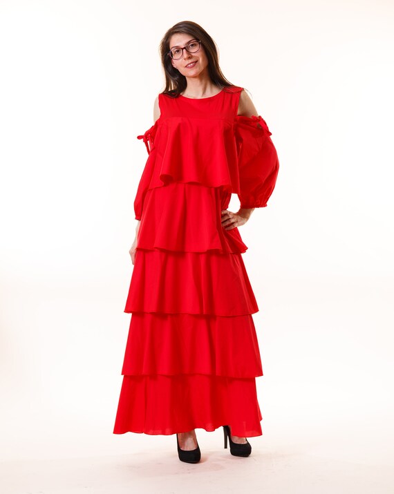Ruffle Cold Shoulder Red Maxi Dress | Etsy red cold shoulder ruffle detail maxi dress