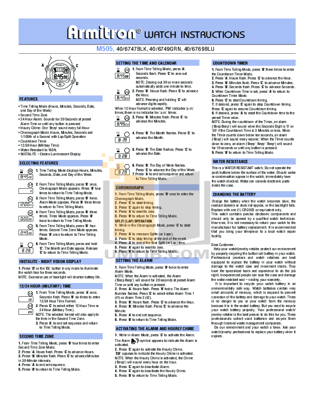 Armitron M505 Watches Other manual armitron watch manual set time