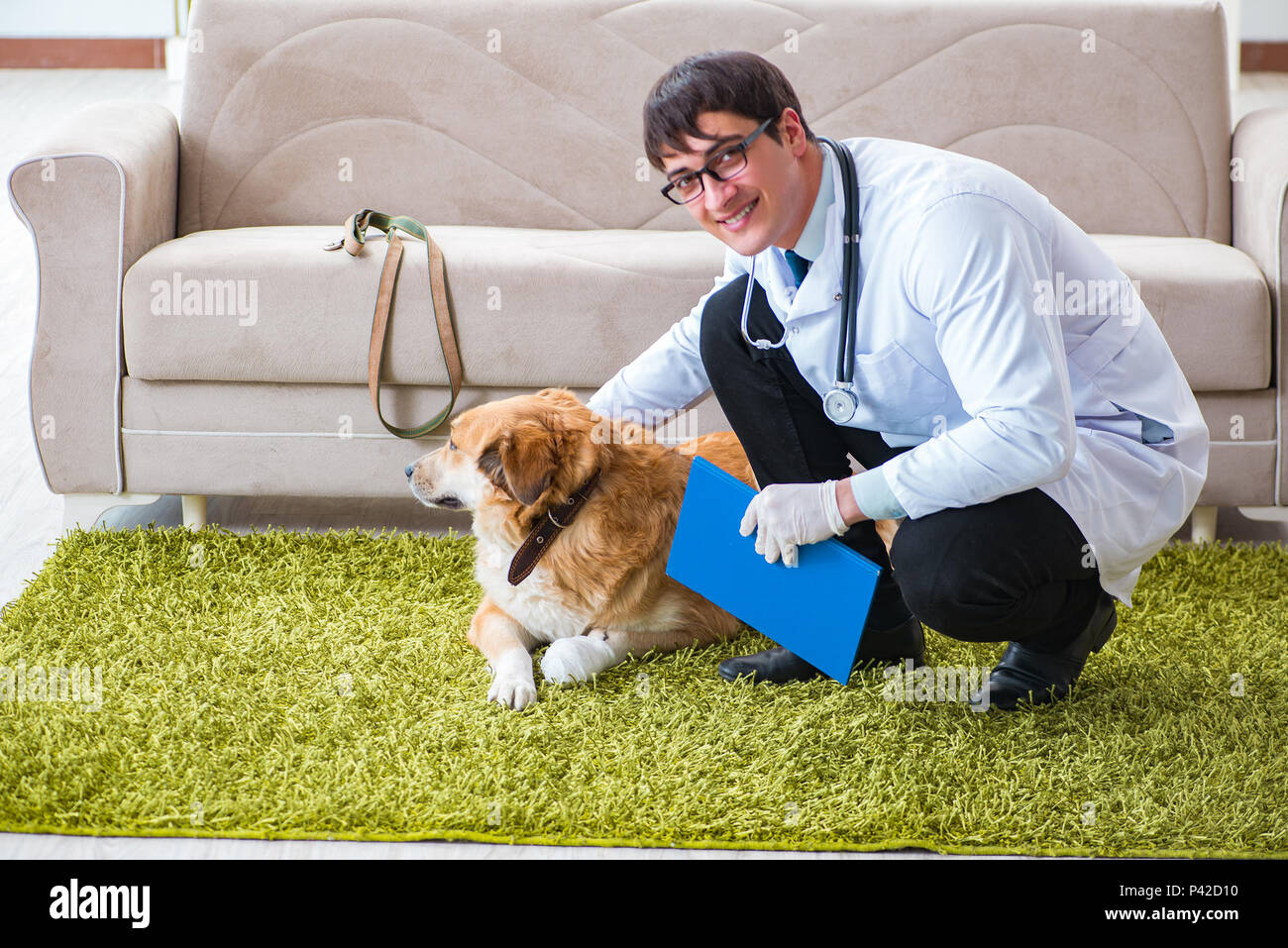 doctor examining golden retriever dog pet doctor home visit