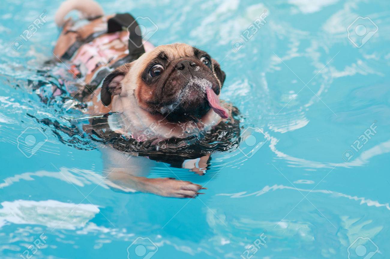 A Cute Dog Pug Swim At A Local Public pug life jacket swimming