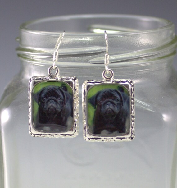 Black Pug Dog Puppy Picture Earrings 3D silver black pug