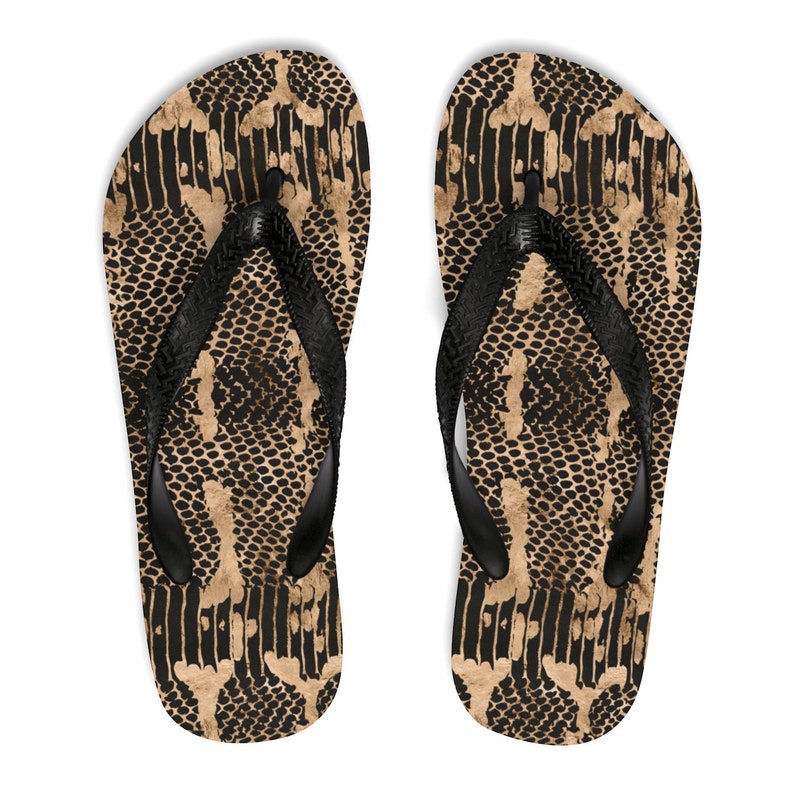 Snakeskin Print Flip Flops Black \u0026 Gold gold beach sandals