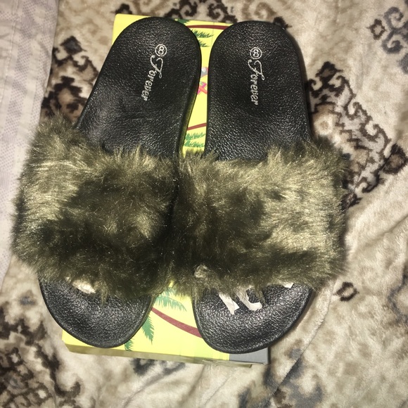 Olive Green Forever 21 Fluffy Slides olive green slides